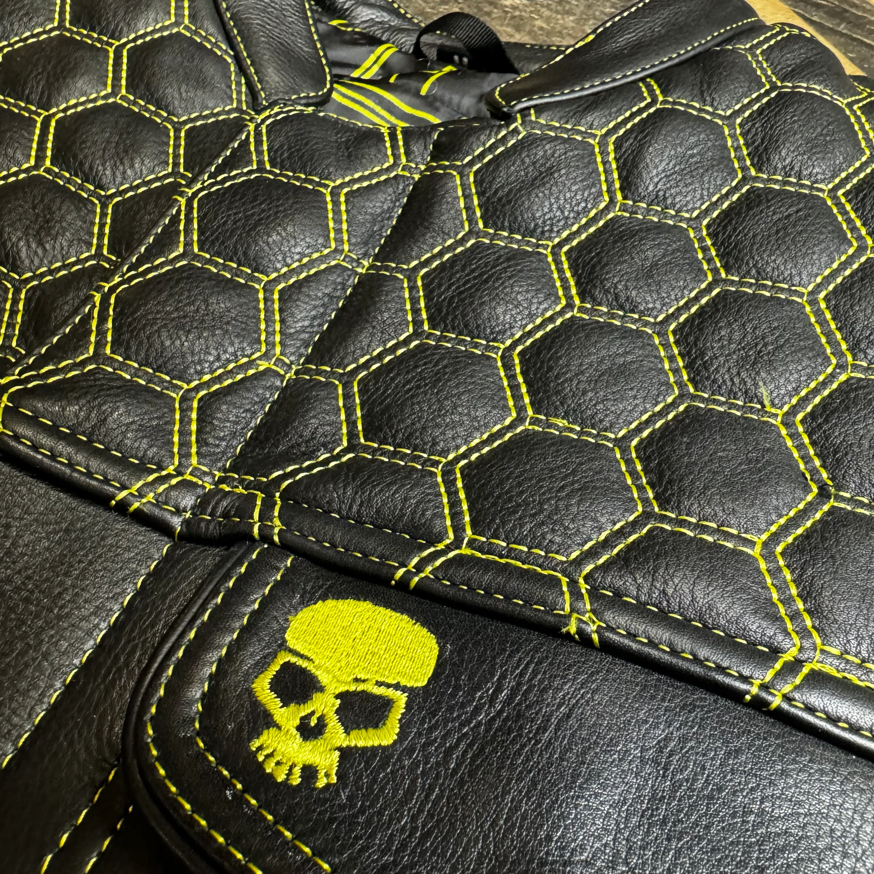 The Rascal Cut showcases a Genuine YKK Zipper on the front and branded buttons. The fully cow hide leather which is a renowned material known for its exceptional strength and durability. To enhance comfort and breathability, a high-quality quilted lining has been added throughout the garment.